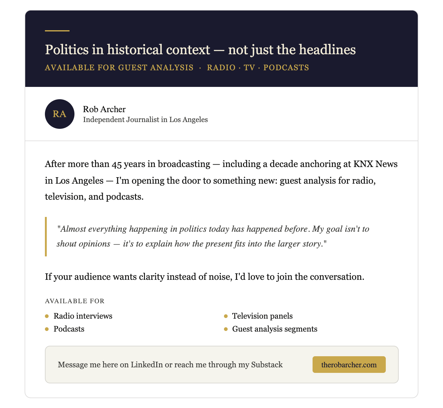 He transitioned into broadcast news at KFI in Los Angeles, developing a reputation for clear, conversational delivery rooted in precision and trust. For the past decade, Rob anchored at KNX News 97.1 FM, one of the nation’s leading all-news stations. There, he covered breaking news events and served as a steady, reliable voice for Southern California listeners.