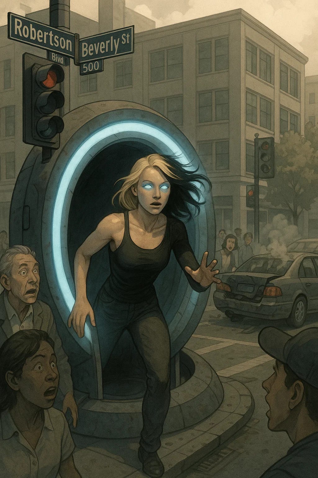 The time pod popped into existence at the corner of Robertson and Beverly. A woman stepped out, startling the pedestrians. A car slammed into the back of another at the stoplight.