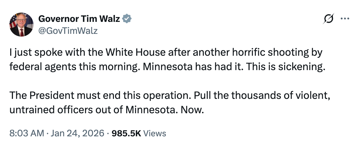 Minnesota Governor Tim Walz condemned the incident, calling it “sickening” and demanding that the federal government end its immigration operation and withdraw federal agents from the state immediately.