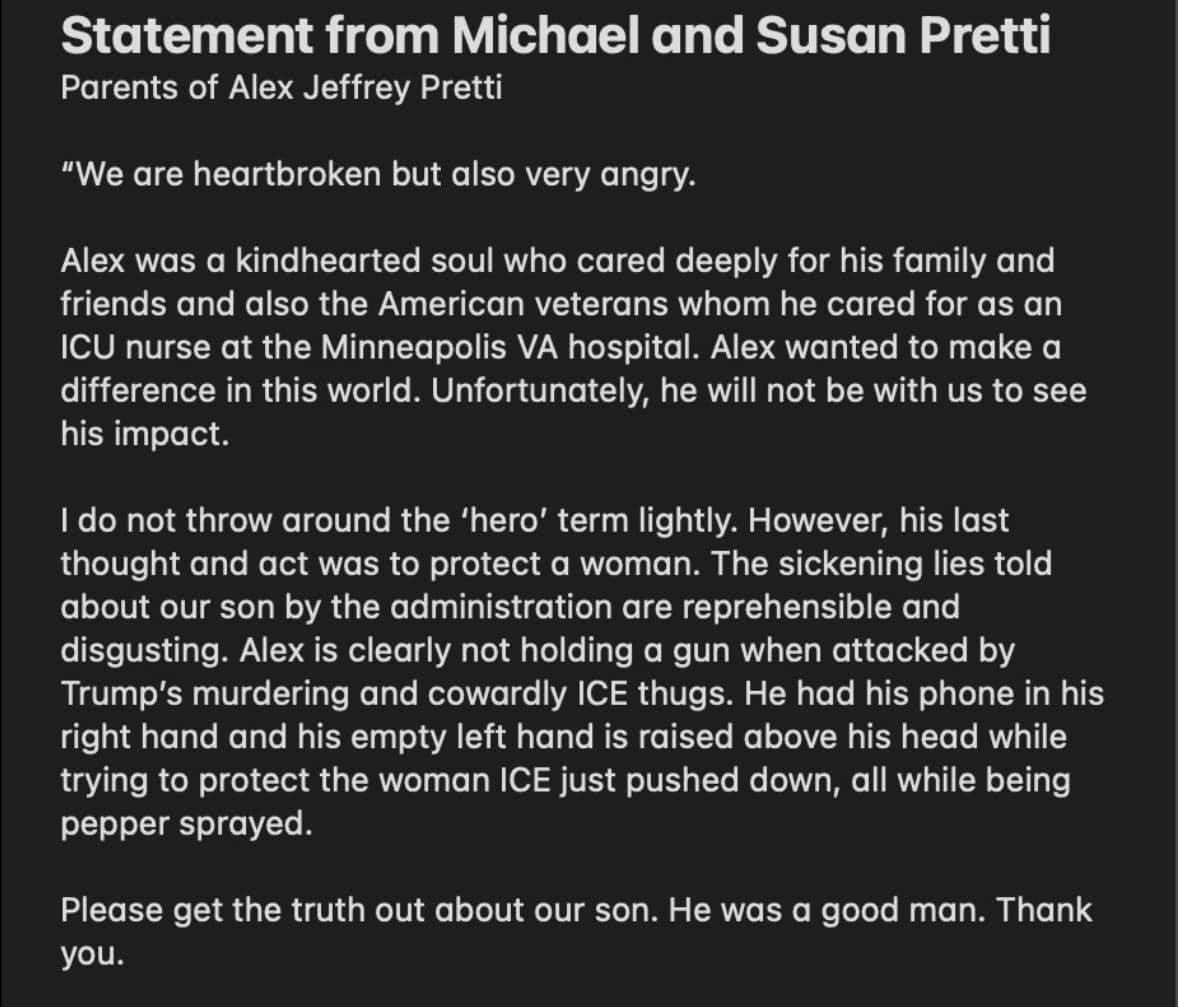 UPDATE: AP reports that family members say the victim, Alex Jeffrey Pretti, was an intensive care nurse at the Veterans Administration who cared deeply about people and was upset by Trump’s immigration crackdown in his city. Pretti, 37, had participated in protests following the killing of Renee Good by an ICE officer earlier this month.