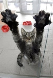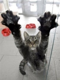 (A cat stretches on a glass door in the animal shelter in Berlin Tuesday, June 26, 2007. The new animal home in the German capital is one of the largest and most modern institutions of this kind worldwide. Every year, about 12,000 animals in difficulties are rescued by the Berlin animal welfare activists.) (AP Photo/Fritz Reiss)