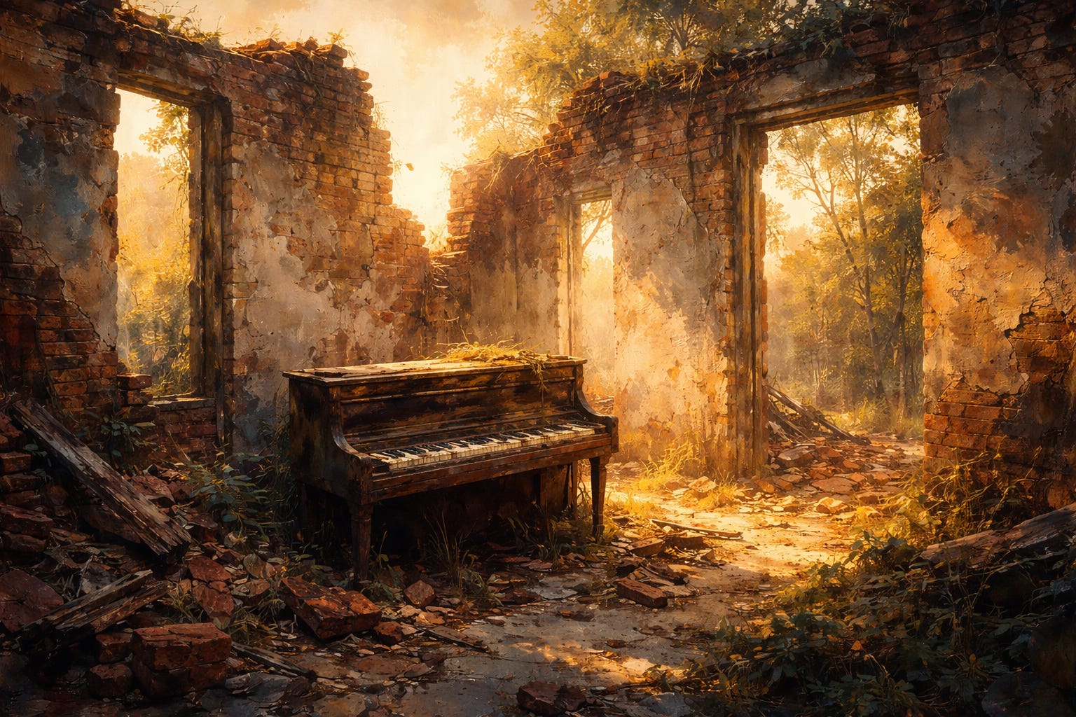 I had a memory from childhood of walking through a half-demolished house — no roof, walls laid bare down to the stone, and an old, broken piano sitting there, exposed to the elements.
