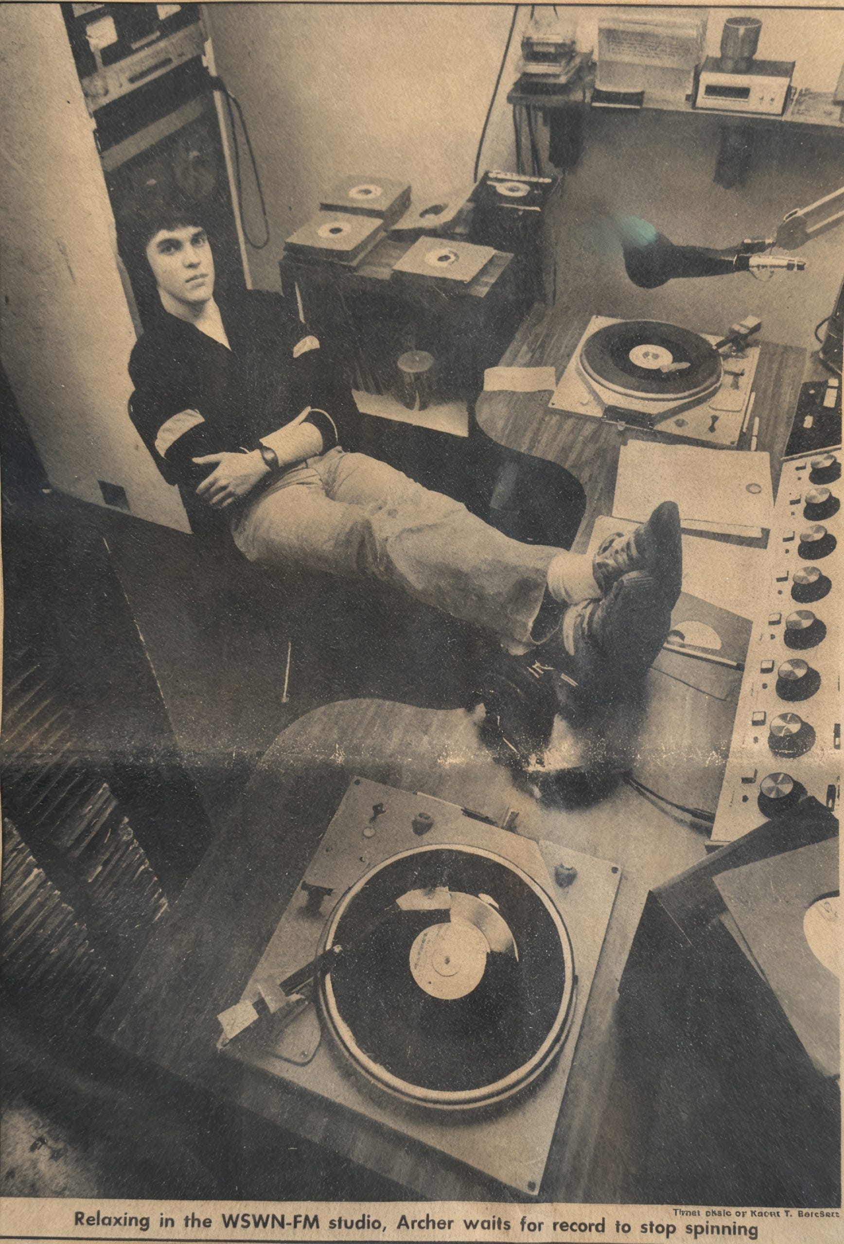1982. On the front page of the local section of the town newspaper. A turntable to the left of me. A turntable to the right. My feet up on the desk, careful not to touch the pots and switches. Leaning back in my chair while the newspaper photographer takes a picture of the “teen deejay” who “says his job is real groovy.”