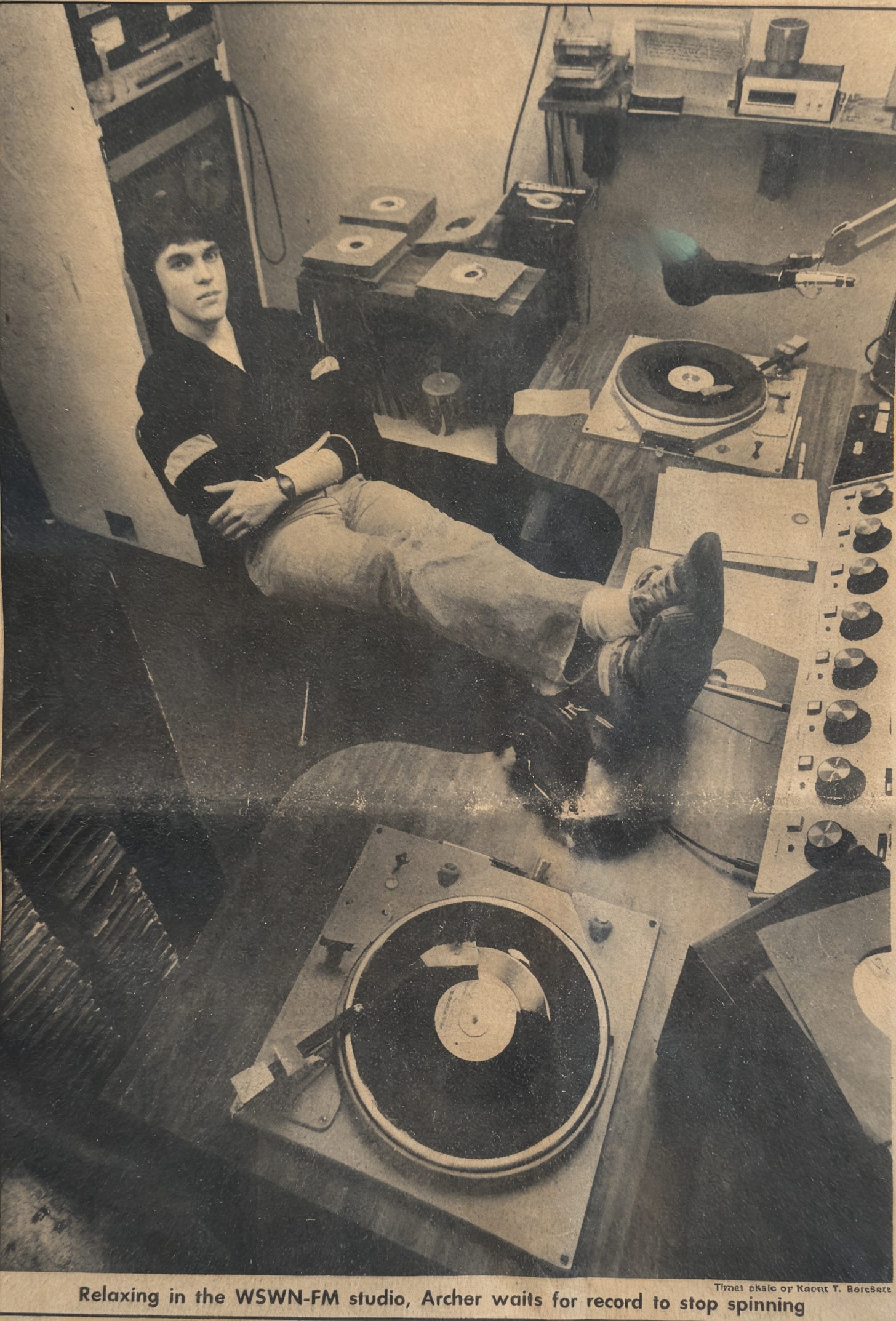 1982. On the front page of the local section of the town newspaper. A turntable to the left of me. A turntable to the right. My feet up on the desk—careful not to touch the pots and switches. Leaning back in my chair while the newspaper photographer takes a picture of the “teen deejay who says his job is real groovy.”