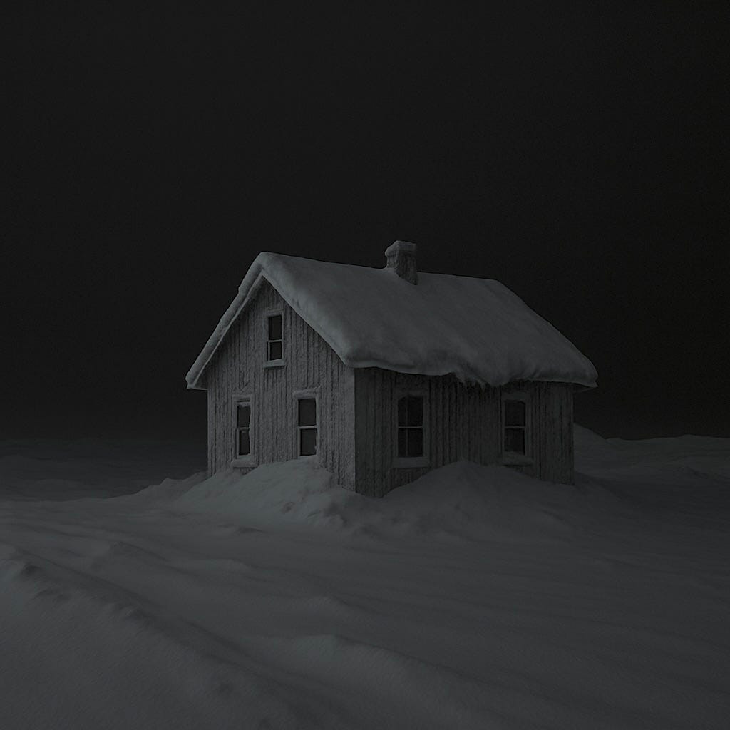 The wind hasn’t stopped since yesterday. It howls at night like it’s calling something. Or warning about something. It rattles the siding and screams under the eaves. Snow—or ice, or ash, I can’t tell anymore—blows sideways past the windows. I tried opening the front door a few inches this morning and it wouldn’t budge. Frozen shut.