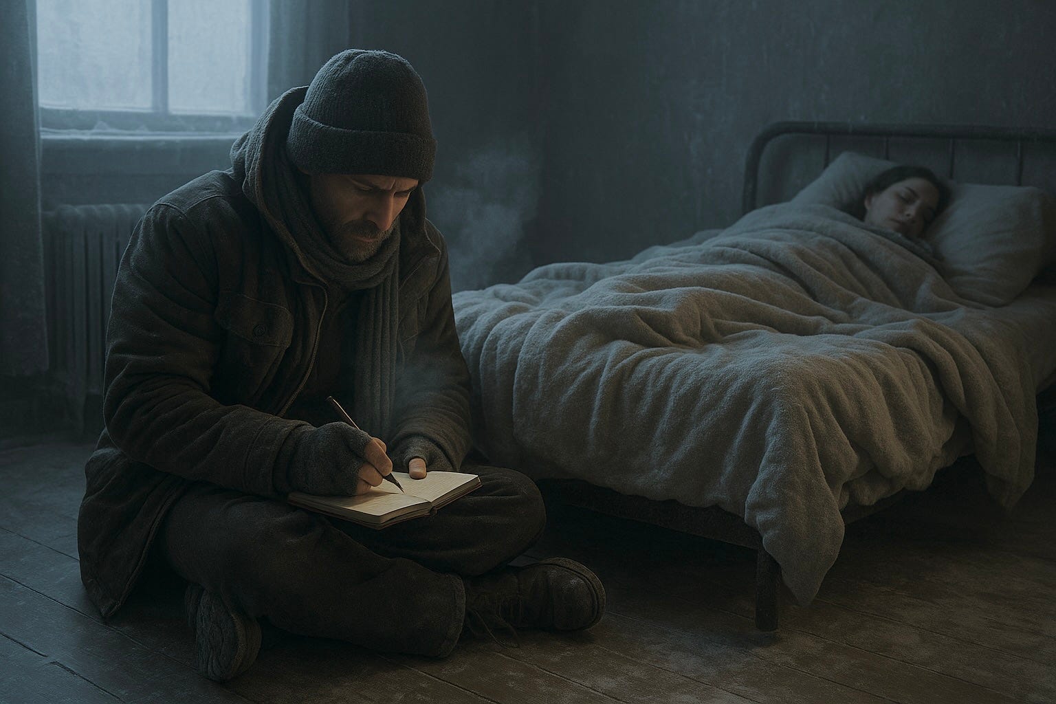 The house is cold. Colder than anything I’ve ever known. We keep the bedroom sealed, stacked with insulation and plastic, but the frost crept in days ago. Our breath hangs in the air like ghosts. Soon, even this ink will freeze. That’s why I’m writing now—before everything locks.