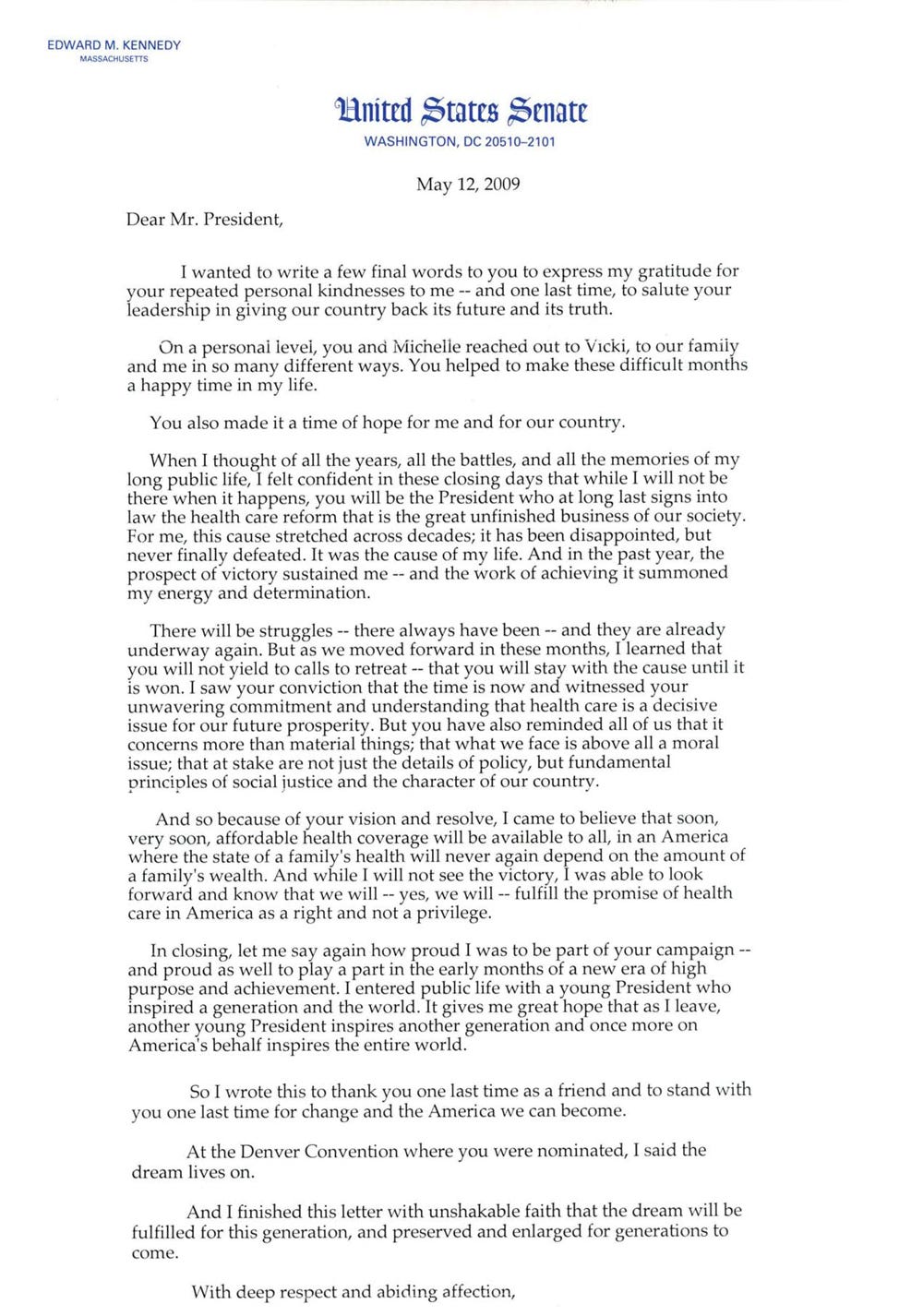 Below is the text of the letter from Senator Edward M. Kennedy referenced by the President in tonight’s address to a Joint Session of Congress.