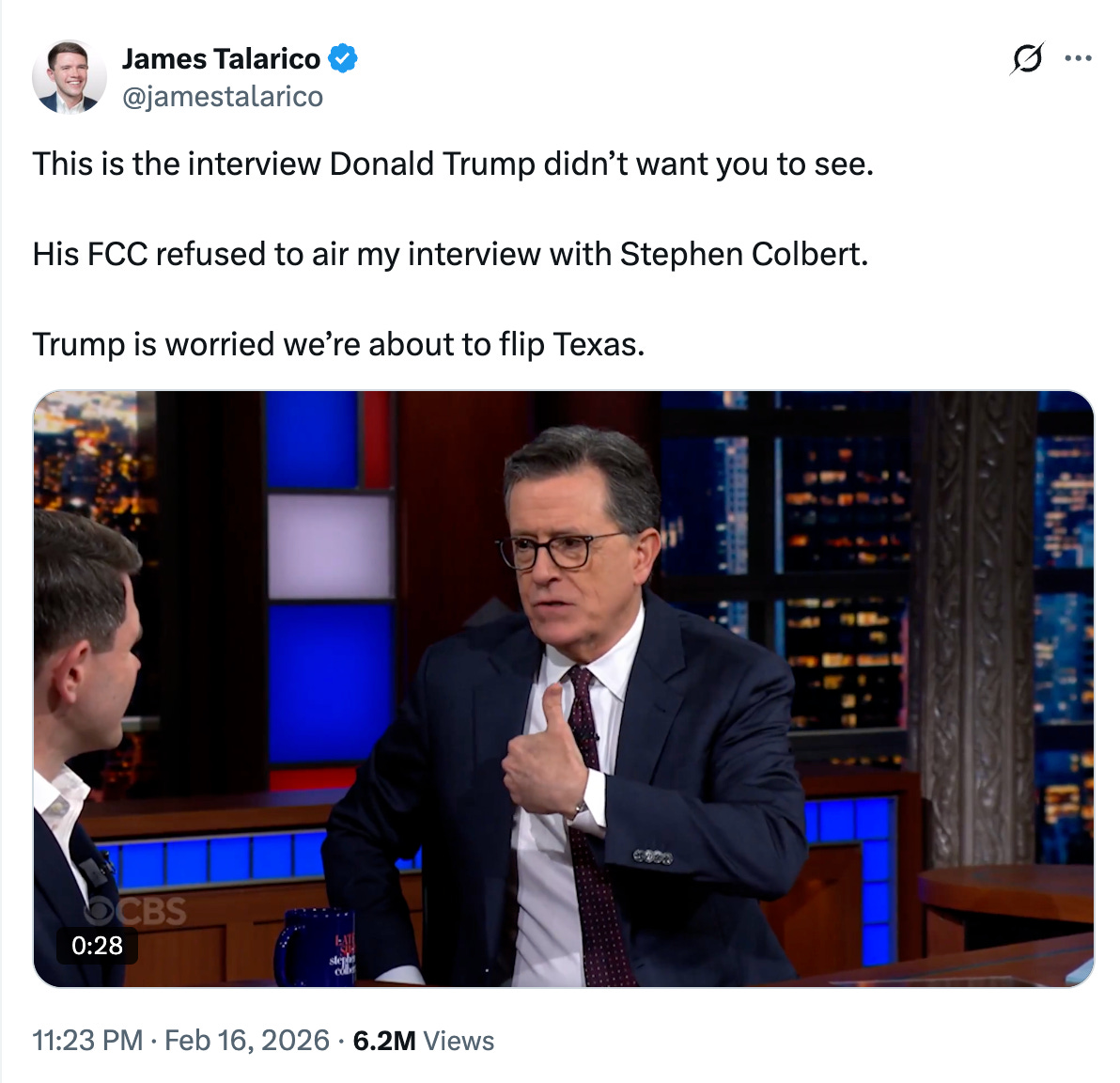 The trigger was the FCC. The agency has opened an investigation into The View after it aired its own interview with Talarico. The suggestion is that letting a legally qualified candidate appear on a talk show might trigger the “equal time” rule — the old broadcast requirement that if you give one candidate airtime, you must offer the same opportunity to an opponent.