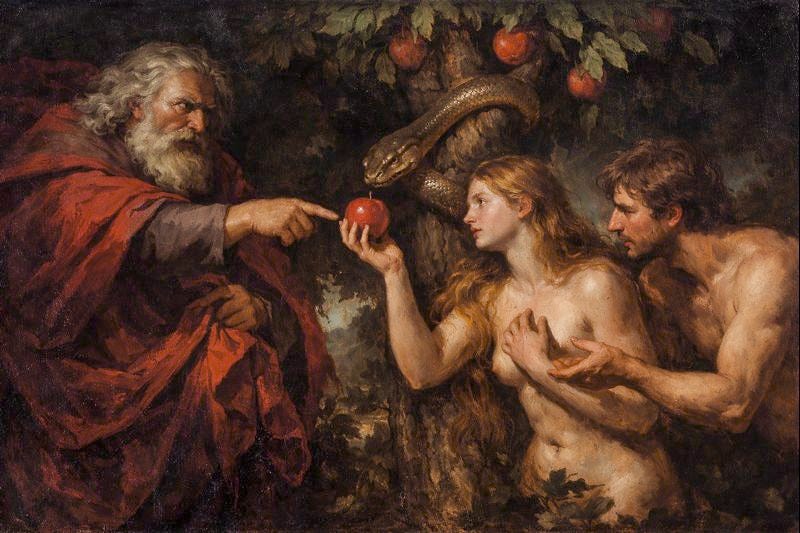 Adam, Eve, and the apple isn’t simply a morality tale about an orgy of lies. It’s a layered one. God withholds context. The snake reframes the risk. Eve decides to test the claim. Adam promptly distances himself from the decision.